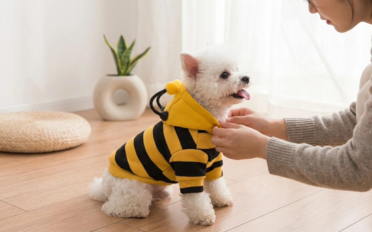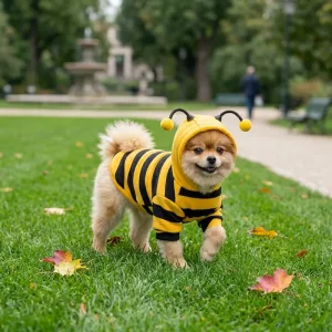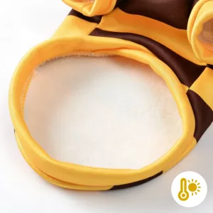 Mehiläisasu sopii koirani pulleaan vartaloon paremmin kuin useimmat vaatteet. Joustava materiaali tekee sen pään yli vetämisestä ja riisumisesta helppoa ilman, että korviin kohdistuu vetoa.