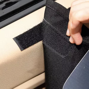 PrimDog-oven suojus sisältää itsekiinnittyvät tarranauhat, jotka on helppo kiinnittää. Ne pitävät peitteen paikallaan iskusta riippumatta.