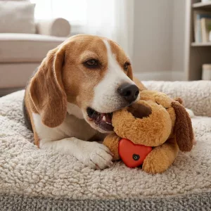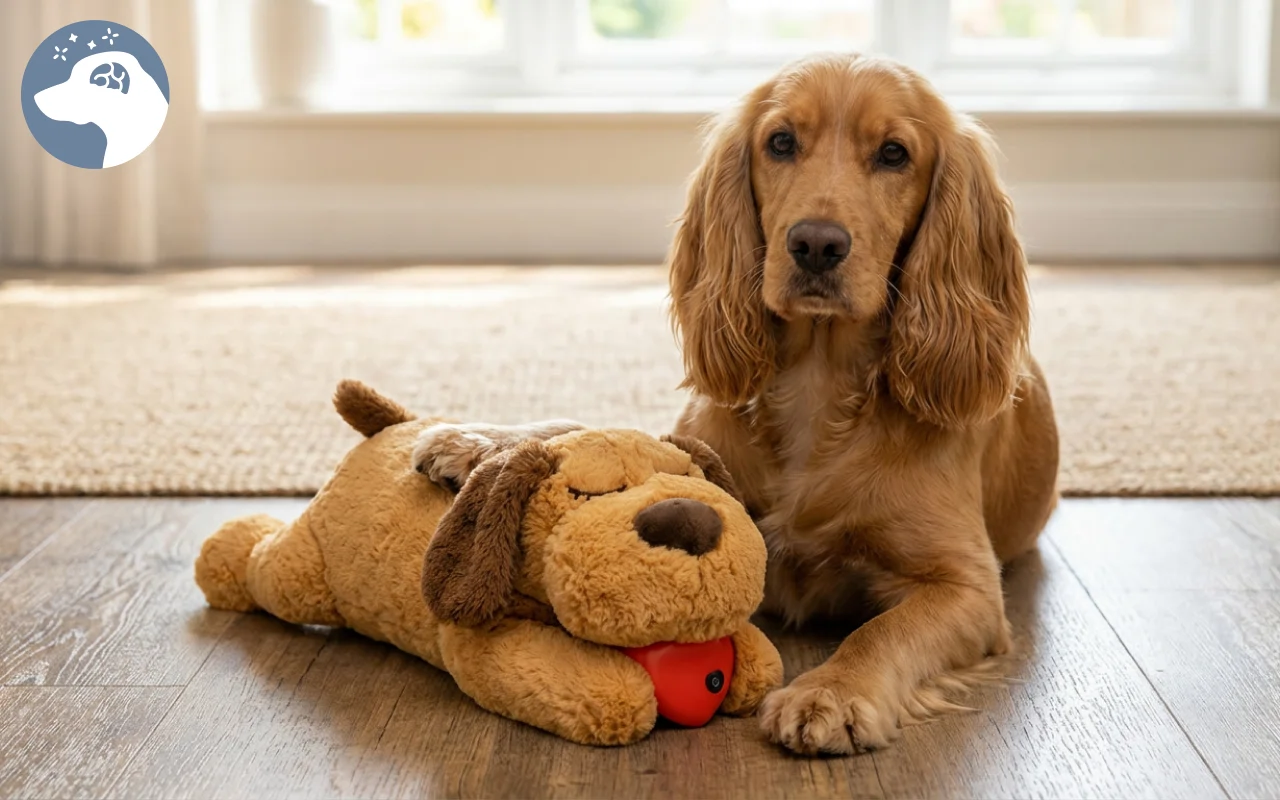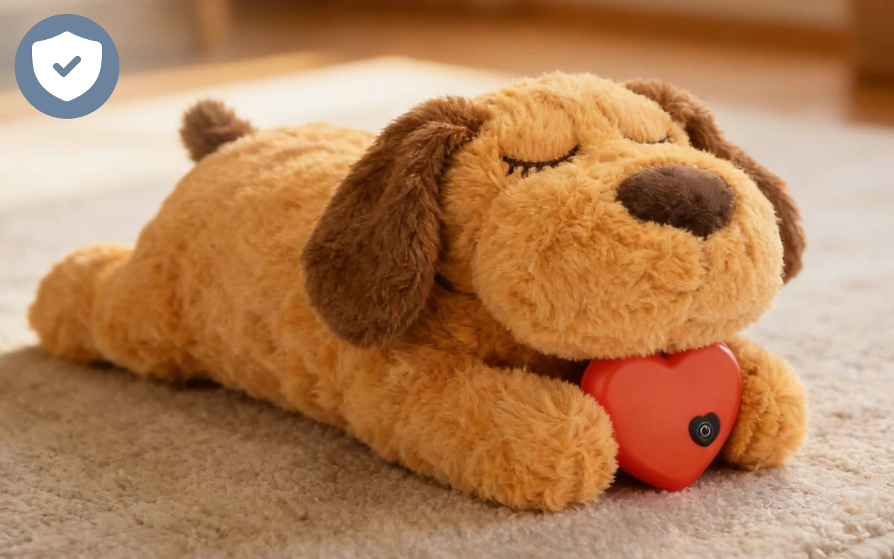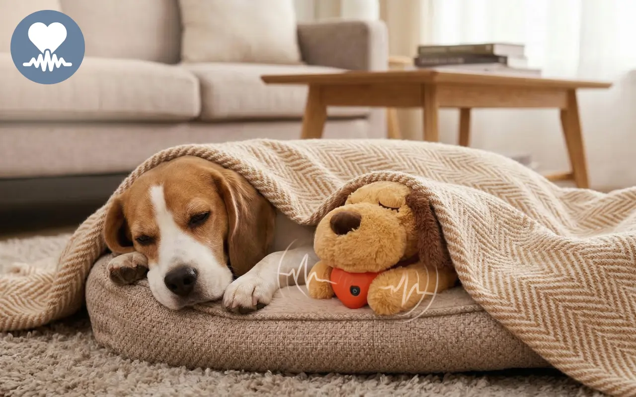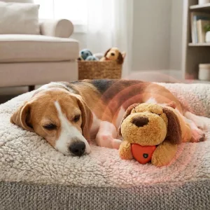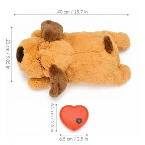 Koirani muuttui öisestä vinkumisesta rauhallisesti nukkuvaksi. Lempeä pulssi on rauhoittava, ja pehmolelu on täydellinen halailuun ja leikkiin!