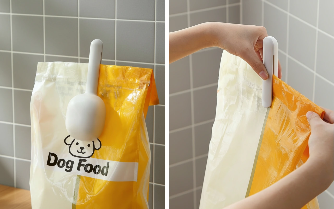 Tämän avulla koirani ruokkiminen käy nopeasti. Ruoan annostelu on helppoa ja klipsi pitää ilman poissa, joten nappulat pysyvät rapeina.