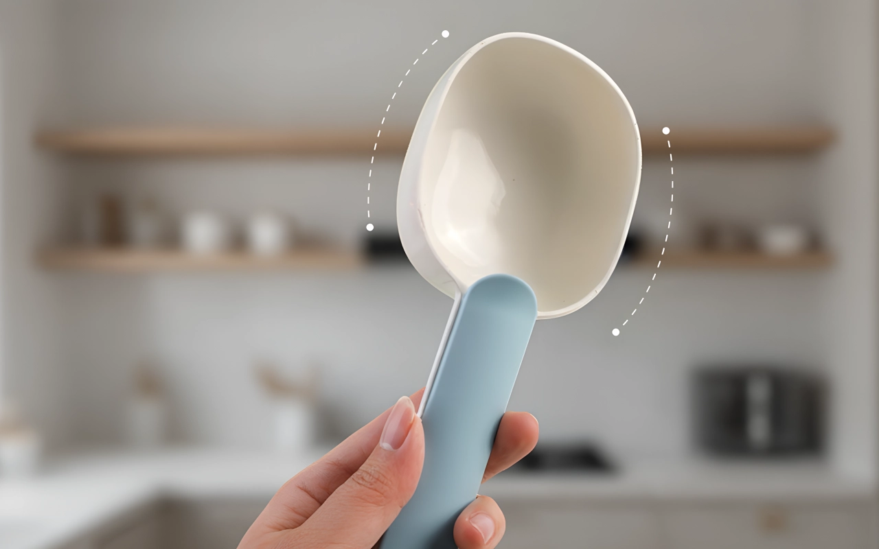 Ei enää sotkua keittiössä! Käytän tätä kauhaa päivittäin ja pussi pysyy tiiviisti suljettuna. Jopa lapseni haluavat auttaa nyt ruokinta-aikaan.