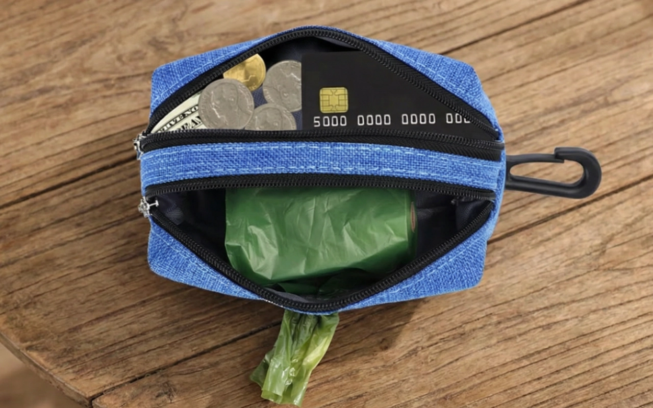 Tämä annostelija pitää kaiken mitä tarvitsen kävelyille. Avaimeni ja herkut mahtuvat, ja pussit pysyvät aina kuivina, vaikka sataisi. En ole koskaan pudottanut mitään!