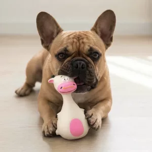 Koira innostui tästä sarjakuvapureskelulelusta heti. Vinkuva ääni saa sen säntäilemään ympäriinsä, ja hassu ilme rohkaisee sitä pureskelemaan lelua pidempään.