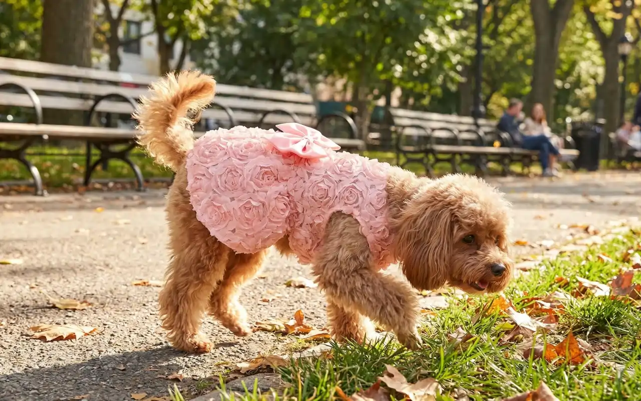 Koira näyttää suloiselta ja rennolta tässä mekossa.