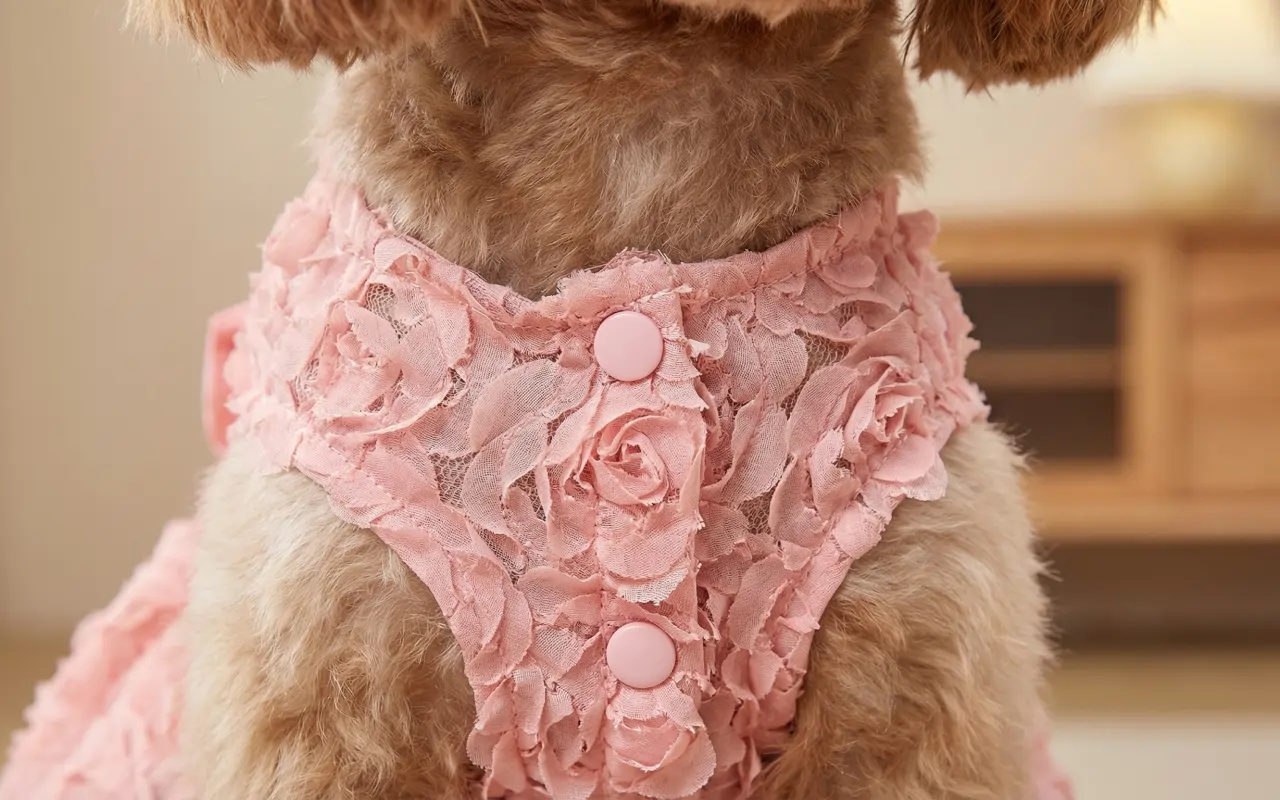 Ostin tämän perhekuvia varten, ja tyttäreni vaati, että koira pitää sitä päällä koko päivän. Mekko pysyi suorana, ei kiertynyt ja näytti siistiltä tuntienkin jälkeen.