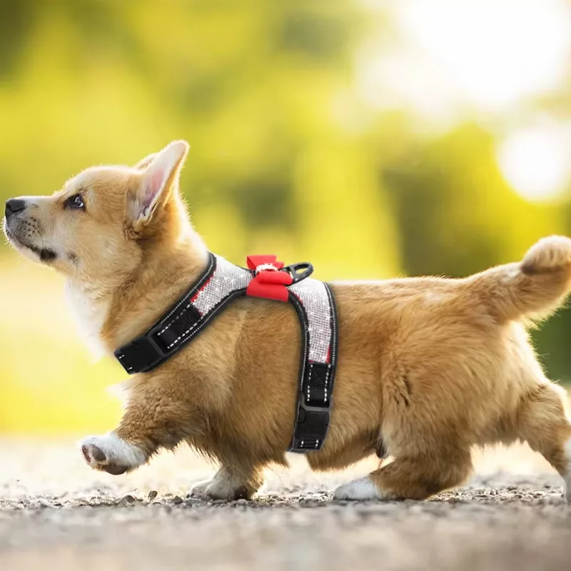 Pikku Bellani näyttää ihanalta uudessa valjaassaan ja rakastan sen kimallusta! Pehmuste tekee pitkistäkin kävelyistä mukavia.