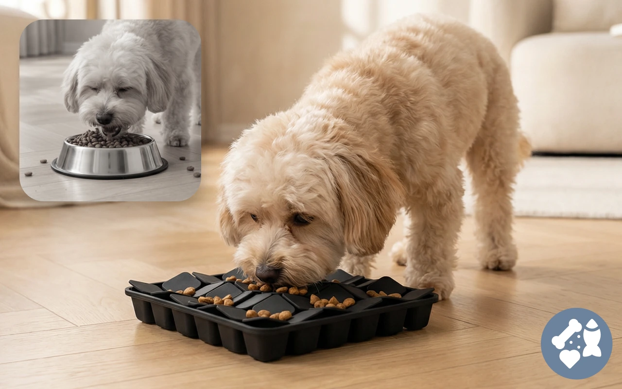 Hidasruokintakulho koirille nuuskumatolla ja imukupeilla