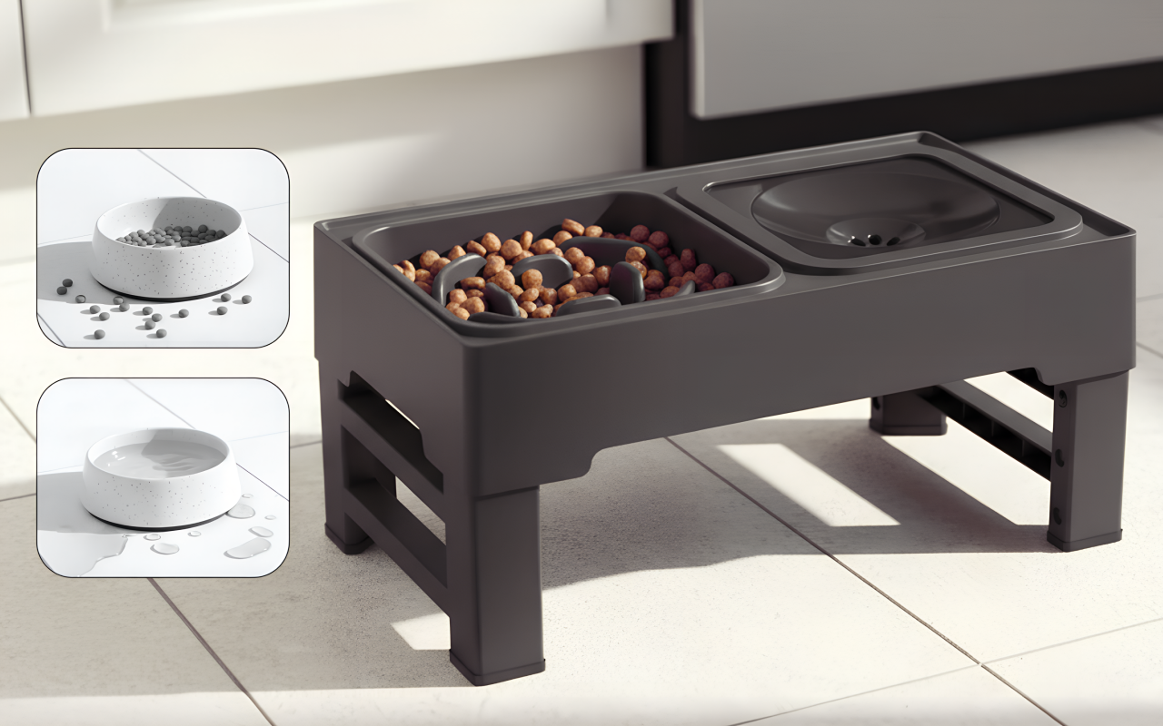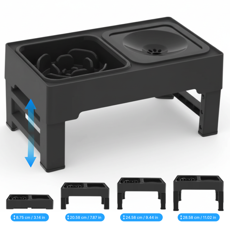 Lemmikit ansaitsevat siistin ruokailualueen jokaiselle aterialle. Puhdistus käy sekunneissa fiksujen irrotettavien osien ansiosta. Säädettävä korkeus tarkoittaa vähemmän sotkua ja enemmän mukavuutta joka päivä. Tukeva rakenne pitää kupit paikoillaan, vaikka ruokailija olisi innokas.