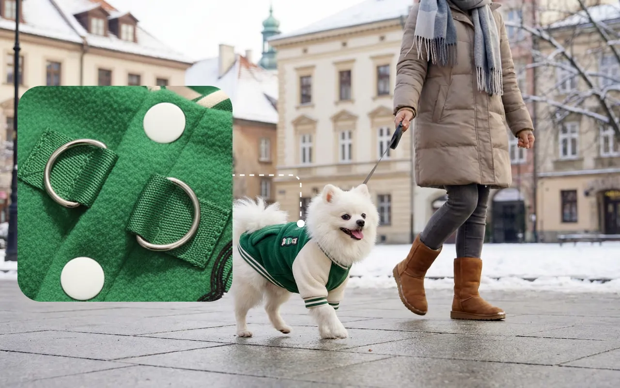 Kiinnitä talutushihna tukevasta renkaasta turvallisiin kävelyihin. Ei ylimääräisen valjaan säätöä - enemmän aikaa ulkoilla yhdessä.