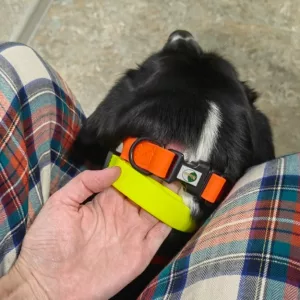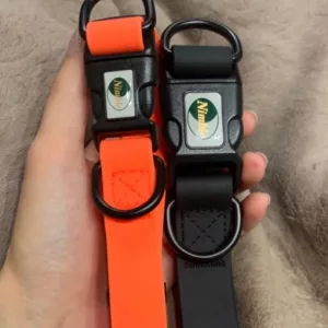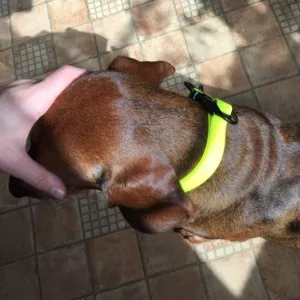 Tämä kaulapanta on varsin käytännöllinen kirkkaiden, näkyvien värien ansiosta. Sen kiinnittäminen hihnoihin on helppoa. Pikalukko on erittäin kätevä, vaikkakin toisinaan jäykkä.